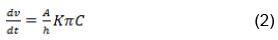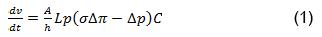 es la velocidad de entrada del agua, A y h son el área y el espesor de la membrana, respectivamente, Lp es la permeabilidad mecánica de la membrana, σ es el factor de semipermeabilidad, Δπ y Δp son las diferencias de presión osmótica e hidrostática, respectivamente y C es la concentración de fármaco en solución. La ecuación anterior puede simplificarse, considerando un orificio que permita despreciar la presión hidrostática dentro del sistema y ejerciendo una presión osmótica en el núcleo mucho mayor que la externa (Δπ>Δp), por tanto reemplazando Lp, p y σ por K considerándose como la constante de la permeabilidad de la membrana, obteniendo la ecuación (2).