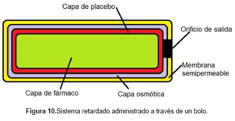 En el caso de los sistemas L-OROS® de gelatina blanda y dura, están diseñados principalmente para ejercer una liberación continua del fármaco, por otro lado el sistema retardado administrado a través de un bolo, está diseñado para proporcionar un impulso a la capa del fármaco. Este sistema comprende tres capas: una capa de retardo o de placebo que consiste regularmente en un polímero inerte, una capa de fármaco y una capa osmótica, todo ello rodeado por una membrana semipermeable. El orificio de salida está ubicado en este caso, en el extremo de la capa del placebo; en conjunto el dispositivo se encuentra en forma de cápsula (Figura 10).