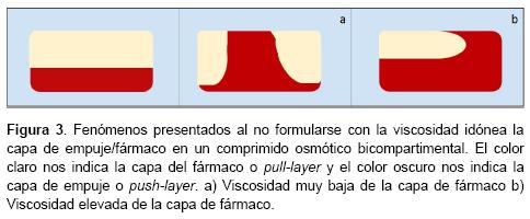 Es importante contar con un balance entre los polímeros, en cuanto a la viscosidad que estos producen al momento de hidratarse, por ejemplo viscosidad muy baja en la capa de fármaco conlleva a un mal funcionamiento, provocando el desplazamiento de esta capa a los extremos, bloqueándose el orificio de salida por parte de la capa de empuje (Figura 3a). Al no tener una capa de empuje ideal y tener una mayor viscosidad en la capa del fármaco existe un desplazamiento de la capa de empuje sobre la capa del fármaco sin generar la presión osmótica requerida para que el fármaco pueda salir (Figura 3b).20,28,30,32