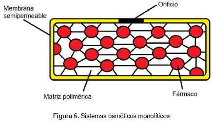 Este tipo de sistemas consisten en la dispersión de un agente soluble en agua (agente osmótico) en una matriz polimérica (Figura 6). El fármaco insoluble es suspendido en la matriz y la cinética de liberación de orden cero está dada tanto por el efecto osmótico como por la capacidad del polímero de mantener el fármaco suspendido. La tableta formada es recubierta por una membrana semipermeable, sobre la que se genera el orificio de liberación. Cuando estos sistemas entran en contacto en un ambiente acuoso dicha matriz sufre rupturas liberándose a través de ellas al medio externo el principio activo. El fármaco insoluble es suspendido en la matriz y la cinética de liberación de orden cero está dada por el efecto osmótico y por la capacidad del polímero de mantener el fármaco suspendido. Sin embargo, este sistema se ve alterado en la liberación del fármaco de una forma impredecible cuando se utilizan grandes dosis puesto que el proceso de lixiviación se ve reducido.2,36,37