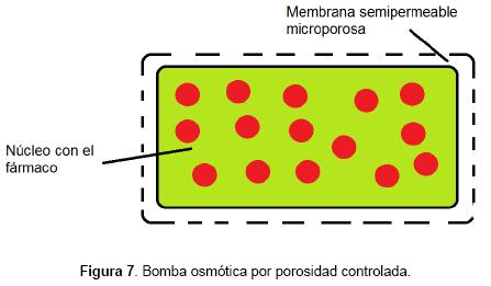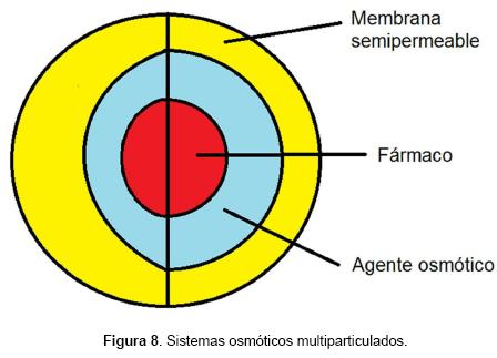 En estos sistemas son utilizados pellets los cuales contienen el fármaco y pueden tener o no, un agente osmótico, éstos son recubiertos con membrana pelicular regularmente de acetato de celulosa (Figura 8). Cuando entran en contacto en el ambiente acuoso, el agua penetra dentro del núcleo y forma una solución saturada de los componentes solubles. La presión osmótica induce a una afluencia de agua, que a consecuencia, resulta en una rápida expansión de la membrana con el objetivo de formar poros. El fármaco es liberado a través de estos, siguiendo una cinética de orden cero. Este tipo de sistemas está claramente influenciado por los componentes de la membrana y la adición de plastificantes.2,39,40