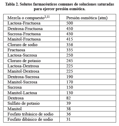 La velocidad de liberación del fármaco en un sistema osmótico es directamente proporcional a la presión osmótica que se ejerce en el núcleo. Si la membrana semipermeable separa una solución de agua o dos soluciones diferentes con concentración de fármaco diferente existe una tendencia a equilibrar la concentración como resultado del flujo de agua. Es de importancia optimizar la presión osmótica entre el núcleo y el medio externo. La manera más simple y más predecible para conseguir una presión osmótica constante es mantener una solución saturada de agente osmótico en el compartimento o núcleo. Si una solución saturada del fármaco no posee suficiente presión osmótica, se debe agregar un agente osmótico adicional a la formulación del núcleo.1,2 Algunos de los compuestos osmóticamente activos más empleados se muestran en la tabla 2.