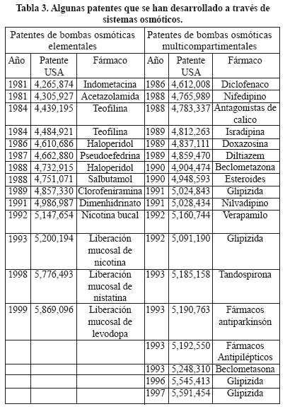 Para los años 70's, Higuchi y Leeper propusieron una serie de variaciones de la bomba de Rose y Nelson,5,6,7 y por otro lado Theeuwes continuó realizando modificaciones hasta diseñar la bomba osmótica elemental (BOE).8,9,10 Esto último dio pie a una serie de patentes, provenientes la mayor parte de la firma Alza Corporation (aproximadamente un 90% de las patentes existentes son de su propiedad) para diferentes sistemas de liberación y vías de administración, que recurren a la presión osmótica como fuente impulsora.2 Sin embargo, muchas de estas patentes han expirado y otras están próximas a hacerlo, lo que ha incrementado el interés en el desarrollo de bombas osmóticas para liberación controlada.