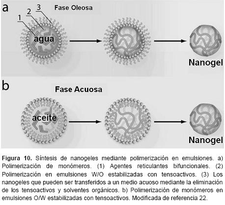 Los métodos de emulsión inversa (W/O) son los más utilizados para la preparación de nanogeles, estos involucran la polimerización de monómeros hidrofílicos en presencia de agentes reticulantes en gotas acuosas que consecuentemente son emulsionadas en una fase hidrófoba continua. El uso de agentes reticulantes en la mezcla de monómeros conduce a la formación del nanogel , manteniendo su identidad después de ser transferidos una fase acuosa continua.22 En el caso de polimerización en nanoemulsión, las gotitas acuosas son generadas por sonicación en un disolvente orgánico como fase continua en presencia de tensoactivos liposolubles. La emulsión termodinámicamente inestable se forma generalmente a una concentración de tensoactivo por debajo o cerca de su concentración micelar crítica. Con las nanoemulsiones se obtienen tamaños de nanogeles entre 150 y 300 nm. El enfoque de nanoemulsión W/O ha sido utilizado para la aplicación de diferentes técnicas de polimerización de radicales controlados: Polimerización por Adición, Fragmentación y Transferencia de Cadena Reversible (RAFT), Polimerización por Transferencia Radical Atómica (ATRP). La polimerización en microemulsión inversa W/O, forma emulsiones termodinámicamente estables. Esto requiere el uso de una gran cantidad de tensoactivos. Por lo general, los nanogeles preparados por este método tienen un diámetro inferior a 100 nm.12