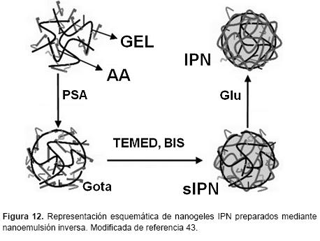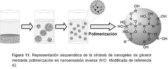 Una serie de nanogeles definidos con diámetro entre 20-120 nm se sintetizaron por polimerización en una nanoemulsión mediante apertura epóxica por catálisis ácida y posterior adición al glicerol. Alcoholes multifuncionales se utilizaron como monómeros y di, tri-epóxidos como agentes reticulantes (Figura 11).42 Nuevos nanogeles con redes poliméricas interpenetradas (IPN) compuestos de PAA y GEL fueron sintetizados por nanoemulsión W/O. El AA estabilizado alrededor de la GEL en cada gota, se polimerizó utilizando persulfato de amonio (PSA) y tetrametiletilendiamina (TEMED) a una relación molar 1:5 y reticulados con N,N'-metilene-bis-acrilamida para formar nanogeles semi-IPN, que secuencialmente fueron reticulados con glutaraldehído (Glu) para formar nanogeles IPN. Además se empleó monolaurato de sorbitán al 2%. El diámetro medio de los nanogeles fue de 355 nm (Figura 12).43