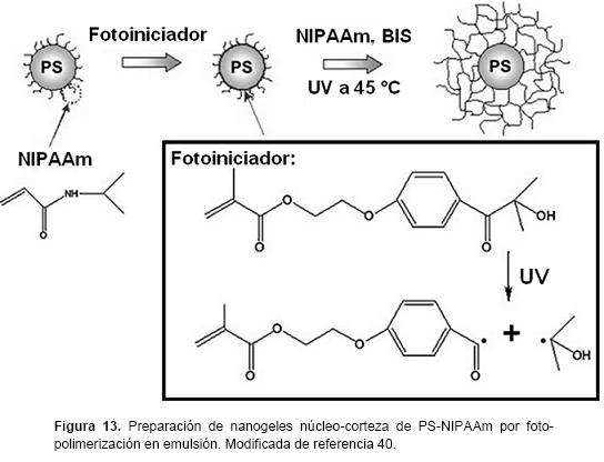 La síntesis de nanogeles núcleo-corteza mediante la polimerización en emulsión presenta algunas dificultades, la más importante es que algunos agentes reticulantes como es el caso de N,N'-metilene-bis-acrilamida tienen una polimerización más alta que los monómeros. Por lo tanto, las partículas del nanogel no crecen de manera uniforme. La distribución del agente reticulante disminuye radialmente en las partículas, lo que influye fuertemente en sus propiedades. La iniciación fotoquímica presenta una solución a este problema. La irradiación UV ha sido empleada para sintetizar nanogeles termo-sensibles bien definidos. Se ha utilizado foto-polimerización en emulsión para preparar partículas núcleo-corteza de PS-NIPAAm. Esta técnica se puede utilizar para añadir cadenas de polímero lineales a las partículas coloidales básicas o para generar capas densas de cadenas aniónicas y catiónicas de polielectrolitos sobre núcleos-PS con el fin de obtener "cepillos" de polielectrolitos esféricos. La síntesis se lleva acabo en tres pasos: primero las partículas de núcleo-PS que contienen NIPAAm se sintetizan mediante una polimerización en emulsión convencional. El paso siguiente es que estas partículas de núcleo son cubiertas por una capa fina del foto-iniciador hidroximetillpropiofenona etilenglicol metacrilato, el cual actúa también como monómero. El último paso es la foto-polimerización en emulsión que se lleva a cabo por el resplandor de luz UV sobre una suspensión de estas partículas, de este modo se generan radicales en su superficie. La polimerización se inicia por estos radicales directamente sobre la superficie de las partículas del núcleo. Las cadenas reticuladas de PNIPAAm generadas se encuentran totalmente injertadas en la superficie de los núcleos (figura 13).40,46