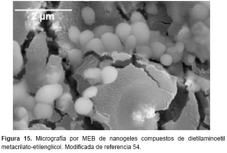 Microscopía Electrónica de Barrido (MEB) tiene la capacidad de producir imágenes de alta resolución (aproximadamente de 3-4 nm) de la superficie de los nanogeles. Las imágenes MEB tienen una apariencia tridimensional que las caracteriza y son útiles para la investigación de la estructura superficial de micro y nanogeles.1 La preparación de la muestra no es sencilla, requiere de recubrimiento con una capa delgada de un material conductor y condiciones de vacío. Figura 15.54