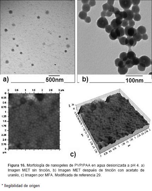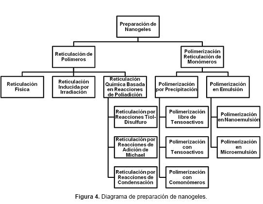 a) Síntesis libre de tensoactivos. El tipo y la concentración de agente reticulante utilizado para la síntesis de nanogeles da la posibilidad adicional de influir en su tamaño y propiedades de hinchamiento sin utilizar agentes tensoactivos. El aumento de la concentración de agente reticulante en la mezcla de reacción disminuye el grado de hinchamiento. Por otra parte, la estabilización también puede ser proporcionada por el monómero y/o polímero. Esto se puede realizar en al menos dos maneras: el iniciador de la polimerización por radicales libres es un ion que, cuando se incorpora a la cadena creciente oligomérica, hace que esta molécula tenga actividad superficial, o bien el sustrato para la polimerización son oligómeros insaturados que llevan grupos ionizados en uno o dos extremos. También la forma en que se preparan, la relación entre los comonómeros y la concentración total de monómeros debe elegirse cuidadosamente para evitar la formación de aglomerados. Una propiedad común de la síntesis por polimerización libre de tensoactivo es la presencia de grupos iónicos en la superficie del nanogel que se pueden utilizar para su modificación adicional, unión de varios compuestos o la reticulación intermolecular.2 Se reportó la síntesis de nanogeles de PAA libres de tensoactivo utilizando como plantilla soluciones acuosas de HPC a temperatura ambiente o mayor. Los PAA unidos por puentes de hidrógeno a cadenas de HPC colapsaron formando los nanogeles. Todos los nanogeles PAA presentan una estrecha distribución de tamaño con diámetros que van de 60 a 600 nm.39