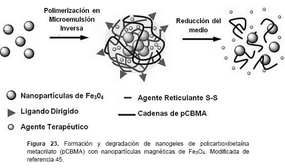 Nanogeles basados en sulfato de condroitina y anhidro maleico, fueron sintetizados por polimerización en microemulsión inversa. El tamaño de estos nanogeles se encuentra en el intervalo de 145-340 nm.44 Nanogeles multifuncionales que encapsulan DEX marcado con fluorescencia y nanopartículas monodispersas de Fe3O4, fueron desarrollados por polimerización de monómeros en microemulsión inversa con un agente reticulante disulfuro. Estos nanogeles tienen un tamaño aproximadamente de 110 nm en solución salina y su tamaño permaneció sin cambios durante más de 6 meses.45