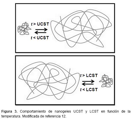 Los nanogeles pH-sensibles que contienen grupos funcionales ácidos o básicos responderán a los cambios de pH.16 En nanogeles termo-sensibles se observan principalmente dos tipos de transiciones de hinchamiento; la transición de temperatura crítica de solución superior (UCST) (generalmente para derivados de ácido acrílico) y la transición de temperatura crítica de solución inferior (LCST) (para derivados de N-isopropilacrilamida).18,23 Los nanogeles de tipo LCST se hinchan abruptamente a temperaturas por debajo de un punto crítico y los nanogeles tipo UCST se hinchan bruscamente a temperaturas por encima de un punto crítico (Figura 3).12 El rango de temperaturas en el cual el nanogel pasa de un estado hinchado a colapsado se denomina temperatura de transición de fase de volumen (VPTT). Nanogeles termo-sensibles de PNIPAAm-co-AAm disminuyen su tamaño conforme aumenta la temperatura; a 20°C tienen un diámetro hidrodinámico promedio de 230 nm y a 35°C es de aproximadamente 120 nm.24