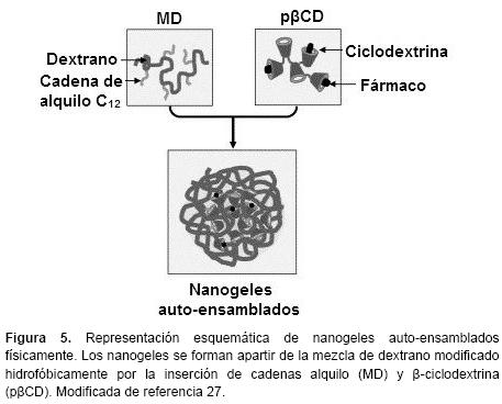 Reticulación física. Los nanogeles pueden ser preparados por reticulación física o química de polímeros de origen natural o sintético en fase homogénea o heterogénea.25 Este método por lo general implica la agregación controlada de polímeros hidrofílicos capaces de tener interacciones hidrofóbicas, electrostáticas y/o puentes de hidrógeno entre sí. El auto-ensamblaje de polímeros hidrofílicos permite la encapsulación de macromoléculas y es útil para la preparación de nanogeles cargados con proteínas.22 Se han desarrollado nanogeles auto-ensamblados físicamente mediante la mezcla de una solución acuosa de β-ciclodextrina (β-CD) con una solución acuosa de dextrano hidrofóbicamente modificado con injertos alquilo. Los restos alquilo en el carbono 12 formar complejos de inclusión con ciclodextrinas (CDs), dejando también CDs libres accesibles para la inclusión de fármacos. Se obtuvieron nanogeles de alrededor de 120-150 nm (Figura 5).27