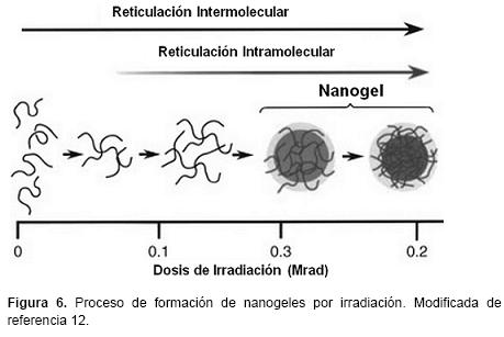 Reticulación inducida por irradiación. La reticulación de polímeros naturales y sintéticos por irradiación, es un método importante para la preparación de nanogeles. Se utilizan diferentes tipos de irradiación: rayos gamma, rayos X, electrones acelerados, haces de iones y rayos ultravioleta. Para algunos propósitos especiales, incluso puede ser útil una combinación de diferentes irradiaciones.12 Este método permite sintetizar nanogeles utilizando cadenas de polímeros lineales y agua como componentes de partida sin la necesidad de monómeros, agentes reticulantes, iniciadores, tensoactivos, etc. El concepto general se presenta a continuación. Cuando un polímero en una solución acuosa se somete a una radiación ionizante, la mayor parte de la energía de irradiación es absorbida por el agua, generando especies reactivas de vida corta, por ejemplo: hidroxilos, protones, electrones solvatados, peróxido de hidrógeno, los cuales pueden reaccionar con el polímero.28 En tales condiciones, se producen radicales no apareados en las cadenas poliméricas lo que permite una recombinación al azar. Dependiendo de las tasas relativas de recombinación y de escisión, un polímero irradiado puede ser reticulado o degradado en fragmentos más pequeños. La influencia de la irradiación de polímeros depende de su estructura química, peso molecular, concentración y las condiciones de irradiación. Dependiendo de la concentración de polímero y la tasa de dosis de irradiación, pueden tener lugar dos tipos de reacciones de reticulación: reticulaciones inter o intramoleculares. Si el número promedio de radicales por una sola cadena es bajo, se puede produce la recombinación intermolecular. Mediante el aumento de la tasa de dosis de irradiación, el número promedio de radicales por cadena también aumenta, la probabilidad de que ocurra una recombinación intramolecular es mayor (Figura 6). La irradiación de soluciones diluidas de polímero conduce a la reticulación intramolecular porque los polímeros se encuentran separados y la recombinación sólo se produce internamente. Por el contrario, mediante la irradiación de soluciones de polímero a una concentración media o alta, principalmente se forman reticulaciones intermoleculares.12