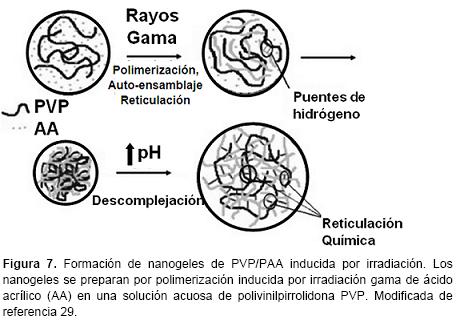 Nanogeles pH-sensibles se prepararon directamente por polimerización inducida por radiación gama de ácido acrílico (AA) en una solución acuosa de polivinilpirrolidona (PVP) (Figura 7). La fuerza impulsora de la formación de nanogeles de PVP/PAA se atribuyó a la formación de complejos entre PAA (donador de protones) y PVP (aceptor de protones) a través de puentes de hidrógeno. Además, los nanogeles se estabilizan a mediante enlaces covalentes, resultado del proceso de reticulación inducido por irradiación. A pH 4 los nanogeles presentan un diámetro medio de 83 nm; mientras que a pH 7 tienen un diámetro medio de 446 nm.29