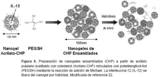 b) Adición de Michael. La adición de Michael entre un nucleófilo (una amina o un tiol) y un grupo vinilo es otra opción de reticulación química, la cual es particularmente útil para la reticulación in situ de nanogeles debido a su tiempo de reacción, su flexibilidad en la formación de múltiples tipos de enlaces, y su relativa inercia biológica de los precursores poliméricos.31 Se prepararon nanogeles ensamblados con forma de frambuesas con un alto potencial como vehículo para la entrega de proteínas (Figura 8). Un polímero de acrilato pululano sustituido con colesterol reticulado con polietilenglicol modificado con grupos tiol (PEGSH) por adición de Michael, produjo nanogeles ensamblados colesterol-pululano con estrecha distribución de tamaños y diámetros medios entre 40 y 120 nm.32 El ensamblaje supramolecular de manano anfifílico, sintetizado por la adición de Michael de 1-hexadecanotiol al manano metacrilato de vinilo, originó en medio acuoso la formación de un nanogel, estabilizado por interacciones hidrófobas entre las cadenas alquilo, con un diámetro hidrodinámico que oscila entre 50 y 140 nm.33