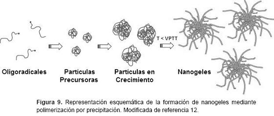 Polimerización por precipitación. Este método es muy útil para la preparación de nanogeles termo-sensibles. En tal sistema, todos los ingredientes incluyendo monómeros, agente reticulante y el iniciador se disuelven en agua. La formación de partículas de nanogel se produce por un mecanismo de nucleación homogénea. A la temperatura de polimerización (50-70 °C), el iniciador se descompone produciendo radicales libres. En el caso del iniciador persulfato, la descomposición da lugar a la formación de radicales sulfato que atacan a los monómeros seguidos de la propagación del radical y crecimiento de la cadena.12 Cuando NIPAAm o VCL son utilizados como monómeros, el crecimiento de las cadenas de polímero colapsa, si alcanzan una longitud crítica de formación de partículas precursoras. Esto ocurre porque la temperatura de polimerización está muy por encima de la LCST de los polímeros formados. Las partículas precursoras formadas pueden crecer mediante los siguientes mecanismos: (a) agregarse para formar una gran partícula de polímero coloidalmente estable; (b) depositarse en la superficie de las partículas de polímero existentes, y (c) crecer mediante la adición de monómeros o macrorradicales. Una vez que las partículas de nanogel alcanzan el tamaño crítico, éstas son estabilizadas electrostáticamente. Las cargas provienen de los fragmentos del iniciador incorporados en las cadenas de polímero durante la nucleación y el proceso de crecimiento. En esta etapa, las partículas de nanogel están en un estado de colapso, pero aún contienen una gran cantidad de agua. Esta es una diferencia principal de la polimerización de monómeros insolubles en agua tales como estireno o acrilato de butilo, donde se forman partículas de látex con estructura compacta durante el proceso de polimerización.37 Cuando se completa la polimerización y la mezcla de reacción se enfría a temperatura ambiente, las partículas de nanogel hinchadas (temperatura por debajo de VPTT) adquieren una morfología "peluda". A estas temperaturas, los nanogeles se estabilizan por un mecanismo estérico debido a la formación de puentes de hidrógeno entre segmentos del polímero y moléculas de agua. La Figura 9 muestra el mecanismo simplificado para la polimerización por precipitación.12