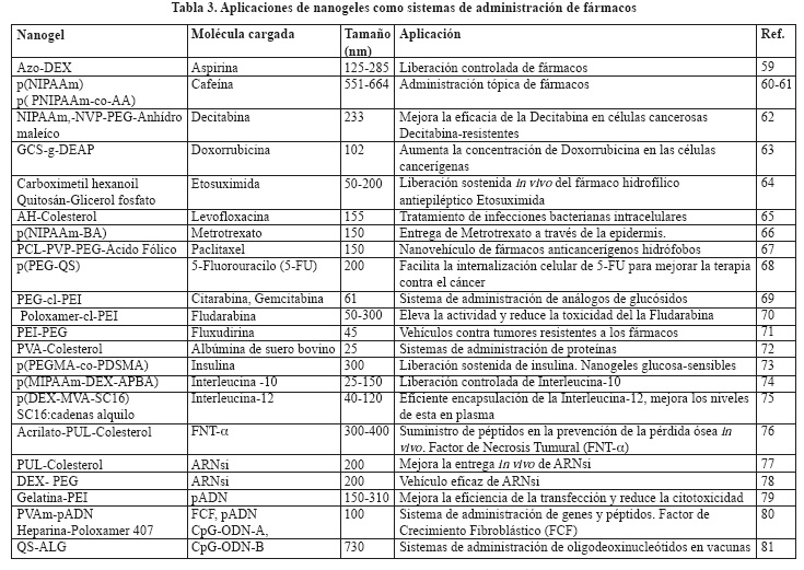 En los últimos años, se ha incrementado el interés por sistemas poliméricos de tamaño submicrónico. Algunos hidrogeles de tamaño en nanómetros denominados nanogeles son capaces de regular la liberación de fármacos en respuesta a estímulos externos de naturaleza física, química y biológica. Esta nanoestructura ofrece muchas características avanzadas como sistema de administración de fármacos (SAF), incluyendo simplicidad de formulación, estabilidad excepcional de la dispersión y almacenamiento en forma liofilizada para su posterior dispersión en medios acuosos, por citar algunas.3