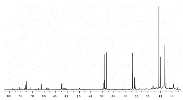 Figura 3 Espectro de RMN de 1H del extracto hexánico de flor de E. arsenei a 400 MHz en CDCl3. Entre 5.40 y 7.90 ppm se apreciaron las señales pertenecientes a los protones vinílicos y aromáticos, así como las señales simples del sistema gem-dimetilo en aproximadamente 1.40 ppm.