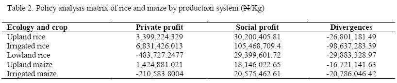 On the other hand Table 2 indicates a positive social profit for rice and maize production in all the ecologies. This implies that the ecologies utilize scarce resources efficiently in the production of both commodities and that the ecologies can survive without government interventions at the margin. There was however, a negative divergence between private and social profits in all the ecologies thus suggesting that the net effect of policy intervention reduced profitability of rice and maize production at the farm level in all the ecologies which is detrimental to producers.