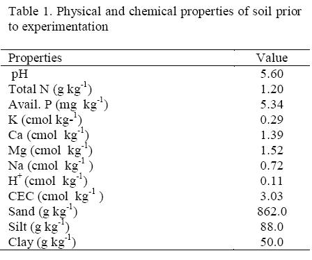 The soil is sandy loam and slightly acidic. The exchangeable bases, total N, and available P were low, implying that the soil was low in fertility (Table 1).