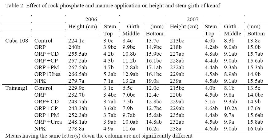 Maximum kenaf growth and seed yield are usually limited by inadequate availability of nutrients. The results highlighted the superiority of fertilized plant over un-fertilized plant in terms of plant height, stem girth and seed yield production. The consistently low performance of the un-fertilized kenaf plants indicates the crop's potential to give optimal yields with adequate fertilization. In this study, the height, stem girth and seed yield were markedly increased by amended ORP, un-amended ORP and NPK fertilizers. This was reflected in increased plant height, stem girth and seed yield. Increase in yield has been reported as an overall benefit that can be derived from phosphate application (Enwezor et al, 1989, Akande et al. 1998; Yusuf et al., 2003, Akande, 2005).