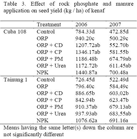 Application of un-amended ORP, amended ORP and NPK fertilizers had significant effect on seed yields of the two varieties of kenaf in both years. The yield ranged from 784.33 to 1440.87 kg ha-1 for Cuba 108 while in Tainung 1, it ranged from 726.45 - 1076.62 kg ha-1 in 2006 and in 2007, it ranged from 472.85 -700.48 kg ha-1 and 522.49 - 691.16kg ha-1 for Cuba 108 and Tainung 1 respectively (Table 3). NPK-treated plants had the highest seed yields in the two varieties. The ORP - amended- treated plants gave significantly higher yields than plants with un-amended ORP which gave yields significantly higher than from the control plants. Yields among the amended sources were however, comparable (Table 3).