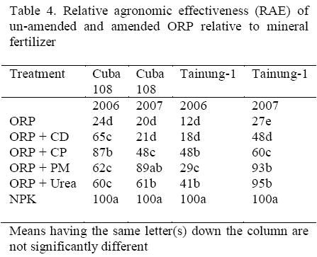 The agronomic effectiveness of un-amended ORP and amended ORP relative to mineral fertilizer ranged from 24 - 87% and 12 - 48% for Cuba 108 and Tainung 1 in 2006 respectively whereas in 2007, it ranged from 20 - 89% and 37 - 95% for Cuba 108 and Tainung-1 respectively (Table 4). The highest relative agronomic efficiency (RAE) value of 87 and 48% were obtained from plants treated with ORP + CP for Cuba 108 and Tainung 1 respectively in 2006 whereas in 2007 the highest RAE values of 89 and 95% were obtained from the plants treated with ORP + PM and ORP + Urea for Cuba 108 and Tainung-1 respectively. The lowest RAE value was obtained from the un-amended ORP in the two varieties of Kenaf in 2006 and 2007.