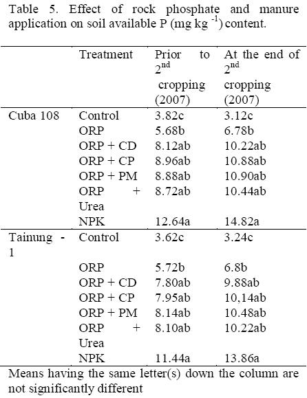 The results showed that the P fertilizers had positive effect on P released into the soil (Table 5). The soil available P values ranged from 4.82 - 12.64 mg kg-1 for Cuba 108 and 4.62 - 11.44 mg kg-1 in Tainung -1 prior to 2nd cropping. At the end of 2nd cropping soil available P ranged from 3.12 - 14.82 mg kg-1 and 3.24 - 13.86 mg kg-1 for Cuba 108 and Tainung -1 respectively. Prior to cropping and at the end of cropping in 2007, NPK application gave the highest value of soil available P and was closely followed by all the amended ORP treatments while the control had the lowest value. All the ORP treatments amended with organic manures and urea were similar and were higher than in plots treated only with ORP. It could be observed from the results that soil available P has tremendously increased in all treatments except the control that decreased when compared, prior to cropping.