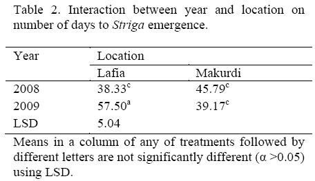 Number of days the Striga emergence differed significantly in the two years, two locations, among the maize varieties tested and the different Striga control methods (Table 1). In 2009, there was a significant delay in the emergence of Striga (48 days after sowing, DAS) as compared to 2008 (42 DAS). At the Lafia location, there was a significant 7 day delay in the emergence of Striga days (49 DAS) as compared to Makurdi (42 DAS). This may be due to higher Striga seed bank density at the Makurdi location than that of Lafia. Maize variety Across 97 TZL significantly delayed the emergence of Striga by 10 DAS as compared to the farmer's local variety (Table 1). Among the different Striga control methods, the result indicated early emergence with the hoeweeded check. This result agrees with an earlier report that pre-planting inoculation with the pathogen caused between 7 and 14 days delay in the emergence of S. hermonthica (Marley, et al., 2005). There was a significant interaction between year and location on number of days to Striga emergence (Table 2). The 2009 X Lafia interaction delayed Striga emergence the most (58 DAS) when compared to earliest with 2009 X Makurdi and 2008 X Lafia interactions by 39 and 38 days, respectively.