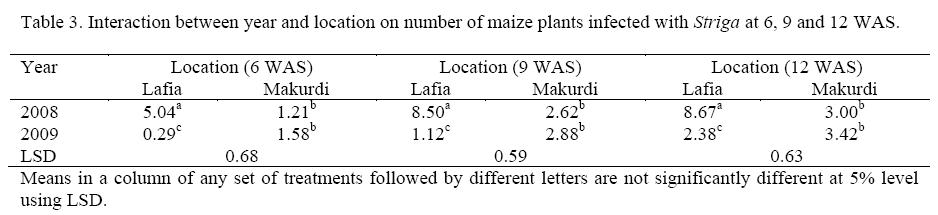 The 2008 X Lafia interactions throughout the period of observation recorded the highest Striga shoot count, but the 2009 X Lafia interactions recorded the lowest.