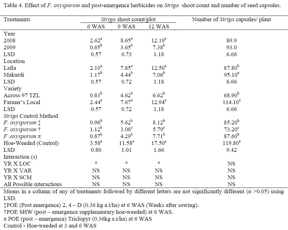 Several decades of research on Striga control technologies have resulted in the identification of a range of technologies. Farmers themselves have developed a range of coping strategies to combat Striga. As none of the available technologies on its own can provide satisfactory Striga control in broad range of biophysical and socio-economic environments, many farmers in West Africa fail to control Striga in cereals, despite the availability of a whole range of control techniques that have proved to be successful. Therefore, there is the need to look at other control options like the use of mycoherbicides that will be environmentally friendly. This study results demonstrate the high potentiality of using F. oxysporum for the control of S. hermonthica as pre-plant (spot application) and there after followed by POE application of either 2, 4 D or Triclopyr at 6 WAS. The use of maize grits, which is readily available to propagate F. oxysporum makes it quite cheap for local farmer's instead of the use of potato dextrose agar.