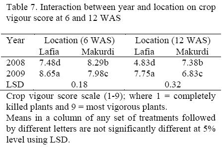 Crop vigour at 6 and 12 WAS, differed significantly at the different treatments (Table 6). In 2009, more vigorous maize plants were observed than in 2008 throughout the period of observation (6 and 12 WAS). Although, not significant, Makurdi recorded more vigorous maize plants than at Lafia. This may be attributed to environmental differences between the two sites and the fewer number of maize plants infected with Striga at Makurdi than Lafia. Throughout the period of observation, the cultivar Across 97 TZL recorded more vigorous maize plants than the farmer's local variety. The tested maize varieties and hybrids are les damaged owing to resistance to Striga ( Kim, 1994; Berner et al., 1995 ). In the Striga control methods, at both periods off observation, the hoe-weeded check had less vigorous maize plants as compared to all plots that received F. oxysporum fb POE application of either 2,4-D, Triclopyr and SHW. There were significant interactions between year and locations on crop vigour score at 6 and 12 WAS (Table 7).Throughout the period of observation more vigorous maize plants, were recorded in the 2009 X Lafia interaction, while the less vigorous plants were observed in the 2009 X Makurdi interaction. Crop stand count at harvest was significantly affected by the different treatments except in the Striga control methods (Table 6). The result indicated significantly higher crop stand count in 2009, at Makurdi, and with cultivar Across 97 TZL. However, in the Striga control methods, although not significant, the trend indicated higher crop stand count in all plots that received F. oxysporum when compared to the hoe-weeded.