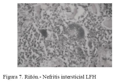 En la piel y en los riñones de los cerdos afectados con el SDNP se observaron una vasculitis linfohistiocítica y neutrofílica leucocitoclástica, Maxie y Robinson (2007) mencionan que estas lesiones están asociadas a una reacción de hipersensibilidad de tipo IV o a infecciones virales y a una reacción de Arthus respectivamente. Segalés et al., (2004) menciona que el cuadro clínico patológico característico del SDNP es ocasionado por una reacción de Arthus.