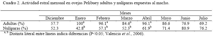 Valencia et al. (2006), evaluaron la actividad estral en ovejas Pelibuey (19° Lat. N) durante 8 meses (diciembre a julio). Se utilizaron ovejas adultas y nulíparas; la actividad estral en ambos grupos se monitoreó utilizando machos adultos provistos con mandil, los cuales se introdujeron diariamente a los corrales de las hembras por un periodo de 15 minutos. Se emplearon cinco machos Pelibuey y el semental se cambió cada dos semanas. Los resultados mostraron que entre el 84.6% y 100% de las ovejas adultas mostraron actividad estral regular entre enero y mayo; en las nulíparas, la actividad estral fue menor en todos los meses. Hubo diferencias entre grupos (P<0.05) de enero a abril (Cuadro 2). Diez ovejas adultas (38%) y cuatro nulíparas (19%) presentaron ciclos estrales sin interrupción durante el periodo de observación. La duración del anestro fue diferente (P<0.05) entre adultas (36.1±8.1 días) y primalas (52.8±23.4 días).