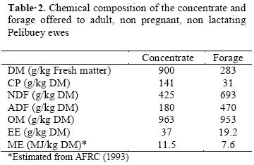 Attempts have been made to determine, energy and protein requirements for hair sheep (Duarte, 2007; Silva et al., 2007), but results have been contradictory and sometimes confusing (Sous et al., 1991; Duarte, 2007), particularly those of the adult ewe. This aspect is critical, considering that adult females define productive efficiency of the system (Ferrell and Jenkins, 1984). Additionally, when metabolizable energy intake (MEI) is below the requirements for maintenance, the animal mobilizes body reserves, particularly fat, leading to the appearance of metabolic and reproductive disturbances which result in a low productive efficiency (Whitney et al., 2009). Moreover current models to determine energy requirements for sheep have been developed mostly with concentrate rations using wool breeds under temperate conditions and little is known regarding energy requirements of hair sheep fed high-fibre rations in tropical environments.