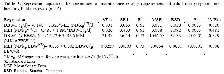 In terms of MEm for adult Pelibuey ewes, in the current study MEI (MJ/d) needed for zero change in BW (BW mean 36.5 kg) was estimated to be 7.85 MJ/d, derived from Equation 4 (R2: 0.67; RSD: 1.49; P: 0.0001 and n: 16).