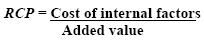 Private cost ratio (RCP). This ratio makes it possible to compare the private efficiency between two different production systems, and is obtained from the quotient of the cost of the internal factors (C) and of the added value (A-B) at private prices. The added value is equal to total income minus the cost of the inputs.