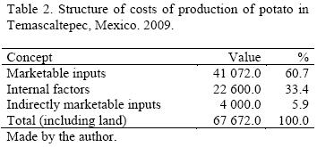Under the conditions stated in 2009, in percent terms, the structure of production costs per cultivated hectare was represented principally by the value of the marketable inputs, followed by internal factors, and finally by indirectly marketable factors. The principal component of the marketable inputs was the cost of seed (69.3%) and within the total cost, including the rent of the land, with 42.3%. In second place was the acquisition of fertilizers and pesticides with 30.7%. In the other hand, in the concept of internal factors, the category of manual labor and diverse materials used in the production of potato participated with 81.2%. The total cost of production in the period of study was $ 41 072 ha-1, of which 68.8% was considered as variable costs and the difference as fixed costs (Table 2).