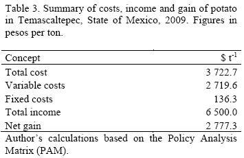 The production of the potato crop in the region of study and for the period of analysis was profitable and competitive, given that it presented positive private gains. The existing market conditions and the agricultural policy of prices during 2009 for the crop constituted an incentive for the production system, given that the mean rural price increased by 52.0%; which favored the total income and the net gain of the crop during this cycle. The above indicates that potato production is and can continue to be a profitable alternative for the producers, and that production technology should be improved to reduce costs and increase production. Improving the quality of the product and avoiding temporal excesses of supply could increase the prices received by the producer.
