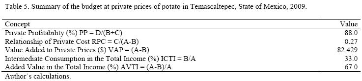 The relationship of private cost was positive but less than the unit, as it presented a value higher than zero and lower than one; coefficient that indicated, just for the year of analysis, that the production system was profitable and therefore competitive. In this sense, the private cost ratio (RCP) for potato in the region of study was 0.27. This value represented efficiency and competitiveness in the use of the resources. In other words, the RCP indicates that the cost of production of the internal resources was notably lower than the added value generated by the activity; and implied that the costs of opportunity of using domestic resources measured in world prices or in currency would be lower than the added value generated by the activity, measured in world prices or currency. This means that although the market conditions are or have been unfavorable for the product, the crop was efficient in the use of the resources, that is, it could present a comparative advantage. With this indicator, the crop represented profitable alternatives of production in terms of the contribution to the income of the producer; despite the above, if the situation of a policy with low prices continues, the production would run the risk of becoming stagnant (Table 5).