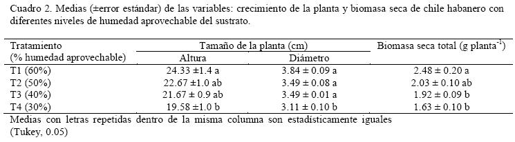 Cuadro 1. Medias (±error estándar) de las variables: humedad del suelo y potencial hídrico de las hojas de chile habanero con distintos niveles de humedad aprovechable.