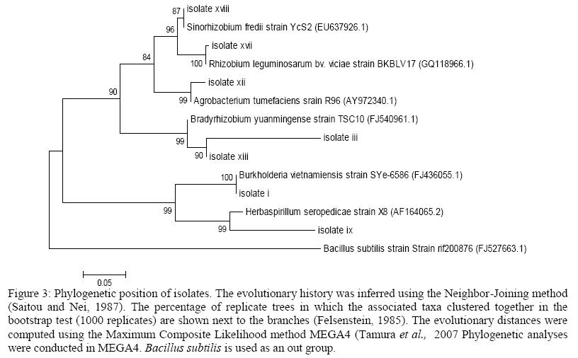 Some ribotypes were displayed by more isolates than others. An example is the ribotype represented in lanes 1, 3, 5, 7, 8, 11, 12, 15, 16, and 17, among others. Less common ribotypes included the one exhibited by isolate ran on lane 6. 7 isolates, one to represent each ribotype, were picked and had their 16 S rRNA genes sequenced. After editing, aligned sequences of representatives of all ribotypes and those of formally described close relatives from NCBI, were phylogenetically analyzed using MEGA 4.0. Two of the ribotypes clustered with Bradyrhizobium, one with Sinorhizobium, one with Rhizobium, another one with Agrobacterium and the other two with Burkholderia vietnamiensis and Herbaspirilium lineage (Figure 3).