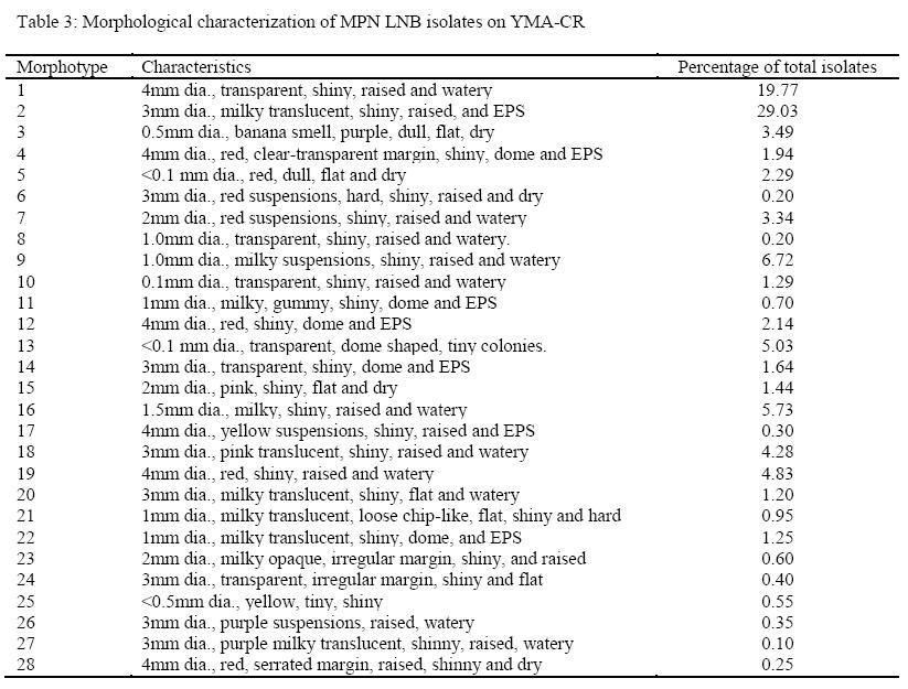 Morphological characterization of the 2008 LNB isolates gave rise to twenty eight (28) morphtypes (Table 3). Morphtype 2 was the most dominant (29.03%) followed by morphotype 1 (19.77%). Almost half of the isolates fell into the two morphotypes. Morphotype 27 was the least abundant with only 2 isolates (0.10%) falling into this morphological group.