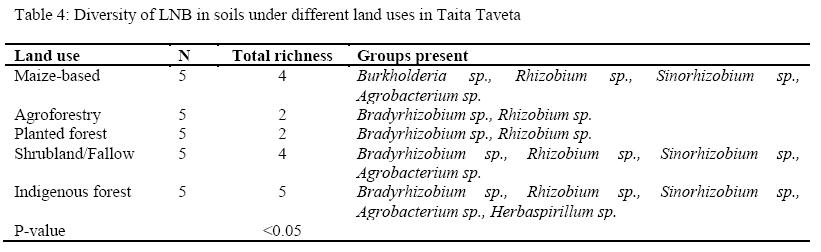 The population sizes determined in these sampling points were within the ranges reported for LNB associated with native woody legumes (mainly Acacia spp.) occurring in diverse ecological regions of Kenya (Odee et al, 1995). There were large variations within landuse systems perhaps due to differences in soil fertility and land use intensity. Shrubland and maize-based systems had some of the highest LNB populations. This is probability due to the presence of various leguminous plant species in Shrubland and the presence of the common bean (Phaseolus vulgaris) in the maize-based system. It has been demonstrated that indigenous common bean nodulating LNB occurring in acid soils (pH ≤ 4.5) of Kenya have a broad host range that include siratro (Anyango et al. 1995).