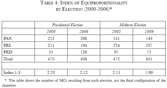 Replicating the index to reflect the recent composition of the Mexican congress since the alternation in power confirms Cheibub's assertion. Table 4 shows that in three out of four elections, the index was above 2.10 whereas only in one (2009), it was 1.90, which is still relatively high. It should be noted that the index of equiproportionality decreases in mid-term elections (when only the lower chamber is elected), but in presidential elections, the president's party usually emerges as the strongest.