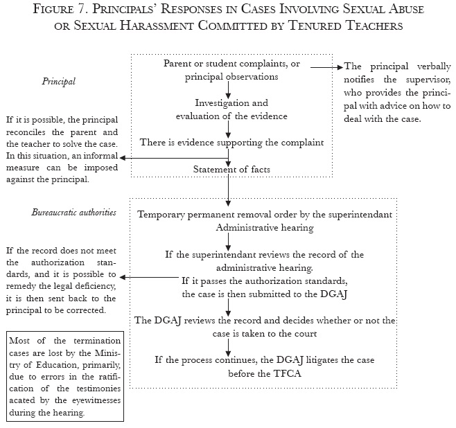 44 Principals interviewed for this paper state that once the administrative hearing has been realized, they rarely find out about the status of the termination procedure or the reasons why a case is not taken by the DGAJ to the TFCA.