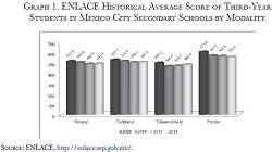 The National Evaluation of Academic Achievement ("ENLACE" for its initials in Spanish), a standardized test recently conducted in Mexico, has been especially useful to measure the performance of Mexico City-based middle school students. The ENLACE exam is administered to Mexican third graders and covers language, math and science.12 The following graph shows the average ENLACE 2008-2011 scores of third-grade students located in Mexico City, according to school modality.13