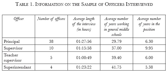 Principals interviewed in the second stage were selected using a convenience sample technique known as snowball.22 This technique was implemented in the following way: first, access was secured to supervisors representing every county in Mexico City; second, every supervisor was interviewed and, at the end of the interview, asked to propose two or three principals for further interviews on this topic. The supervisors were told that the principals chosen for the interview must have experience in dealing with underperforming teachers. Because it was not possible to determine the sample size of interviewees a priori, the saturation point criterion was used.23 This criterion assures that the sample size is determined by the amount of additional information given by the last unit interviewed. Using the aforementioned standard, interviews were realized in the second stage with 38 principals, 10 supervisors, 5 teacher supervisors and 4 superintendents. The teacher supervisors and superintendents were also contacted through the supervisors. Only 5 of the 57 officers interviewed did not permit the interview to be recorded. Table 1 shows information on the sample of officials interviewed in the second stage.24