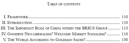 Therefore, this article discusses the framework of a global economy currently under construction. It also tries to explain the important role of China in the BRICS group. Finally, it gives some general considerations of Goldman Sachs's irreverent proposal and predictions.