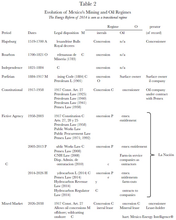 The upstream business model proposed in 2014, in which the Nation is deemed to be the fictive developer of Mexico's petroleum estate, may be regarded as a transitional regime that will last, at most, two presidential terms. A third energy reform will take then take place; it will be a mixed-market regime in which the legal figure of concession will be restored for the oil sector (Table 2).