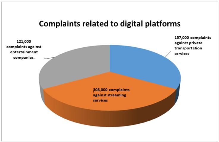 In the first quarter of 2018, 1.7 million possible fraud complaints were registered, of which 59% came from e-commerce.41 Regarding digital platforms, a total of 308 000 complaints were filed for streaming services, 157 000 for private transportation services, and 121 000 for entertainment companies.42